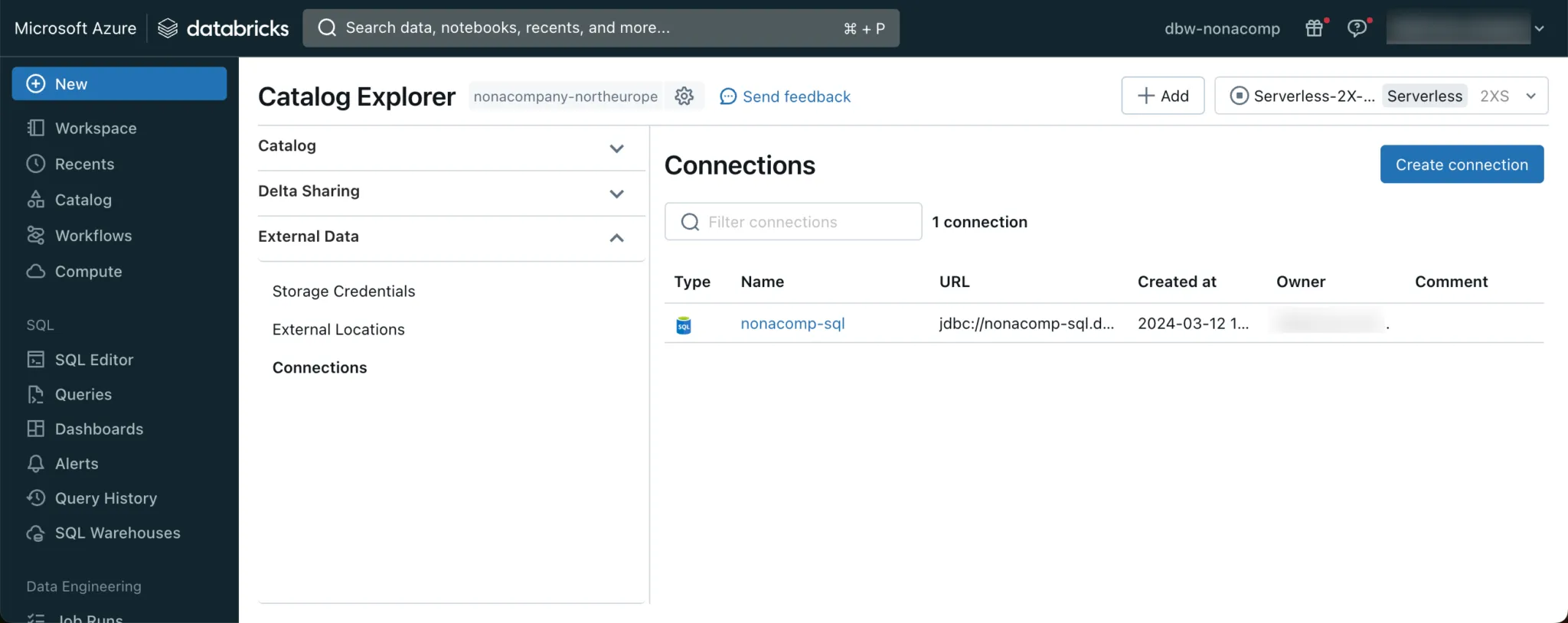 So I have registered the Azure SQL Server as an external connection in Unity Catalog.