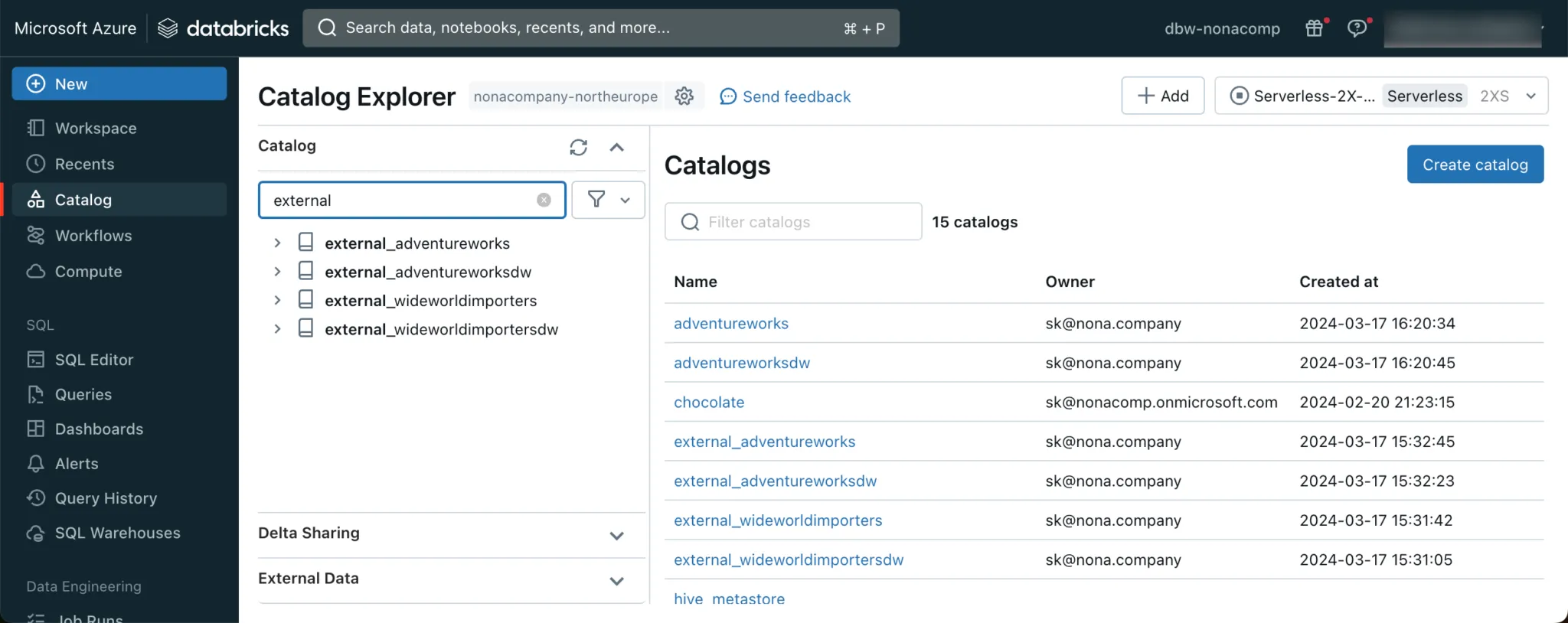 I then created a catalog for each of the respective databases from this connection. So that they were immediately recognizable as such, I prefixed them with “external_”.