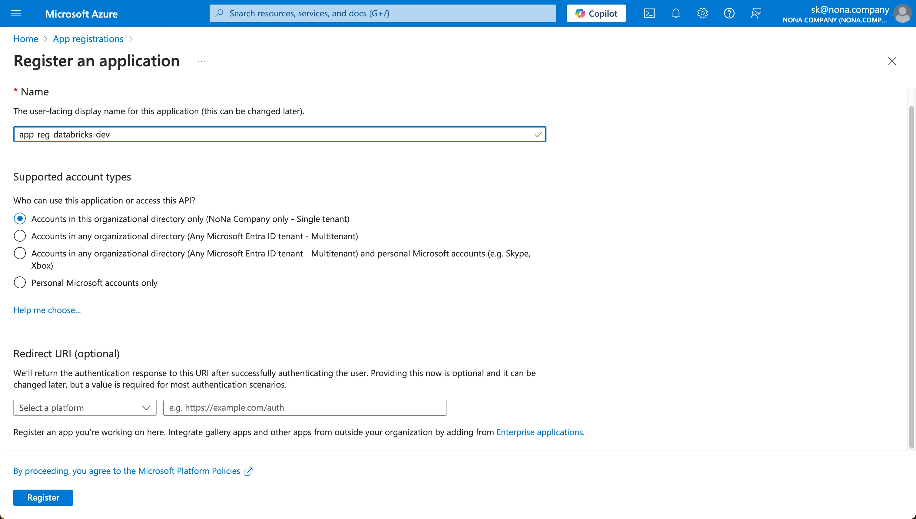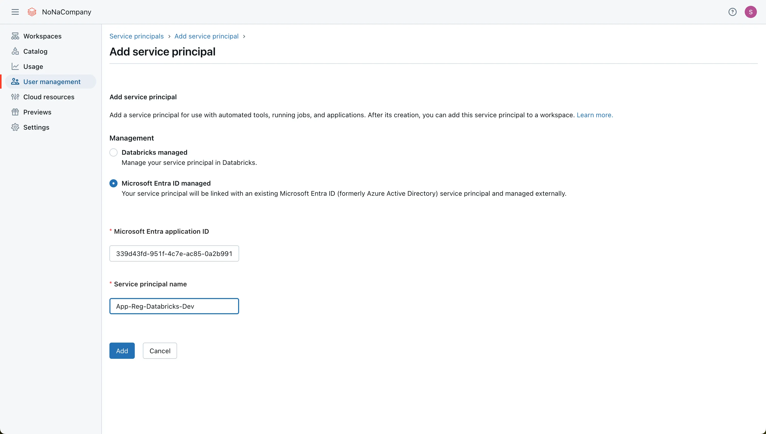 I go to the Databricks account for user management in the next step. I add a new service principal under the “Service principals” tab.