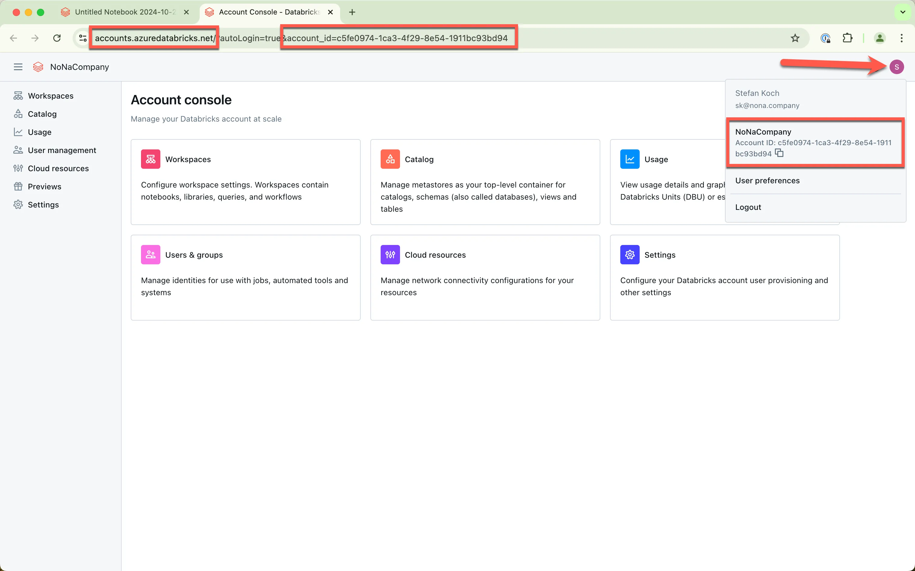 You can find the information you need by logging into your account. You can log in to the account from the workspace, or you can use the URL you already know. Click on the name of the Databricks workspace, and the “Manage Account” option will appear.