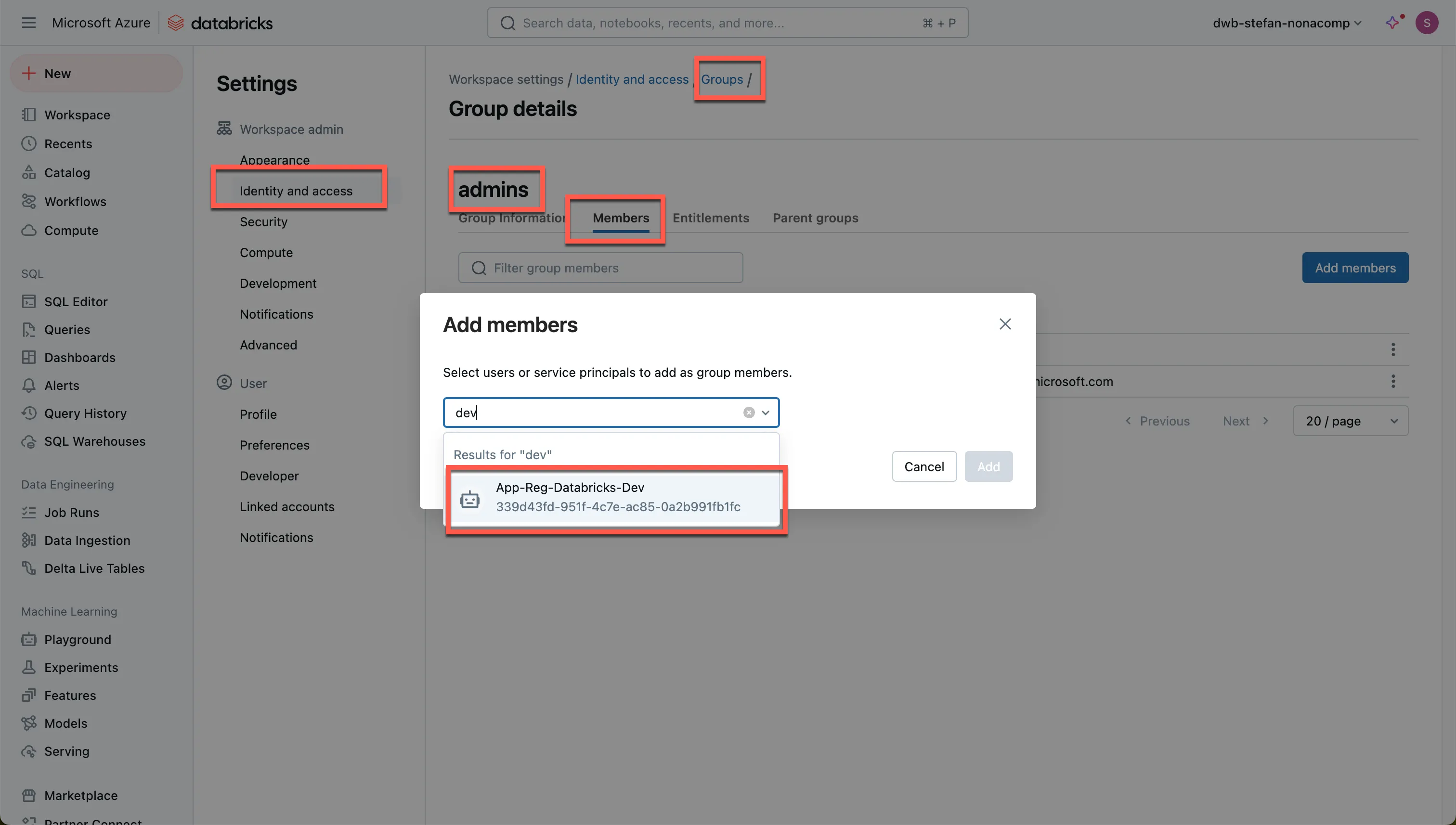 However, I do not get a value back here, but with the dev profile, I get the information. Again, a missing authorization is the problem. In the Databricks workspace, I add the service principal to the administrator group: