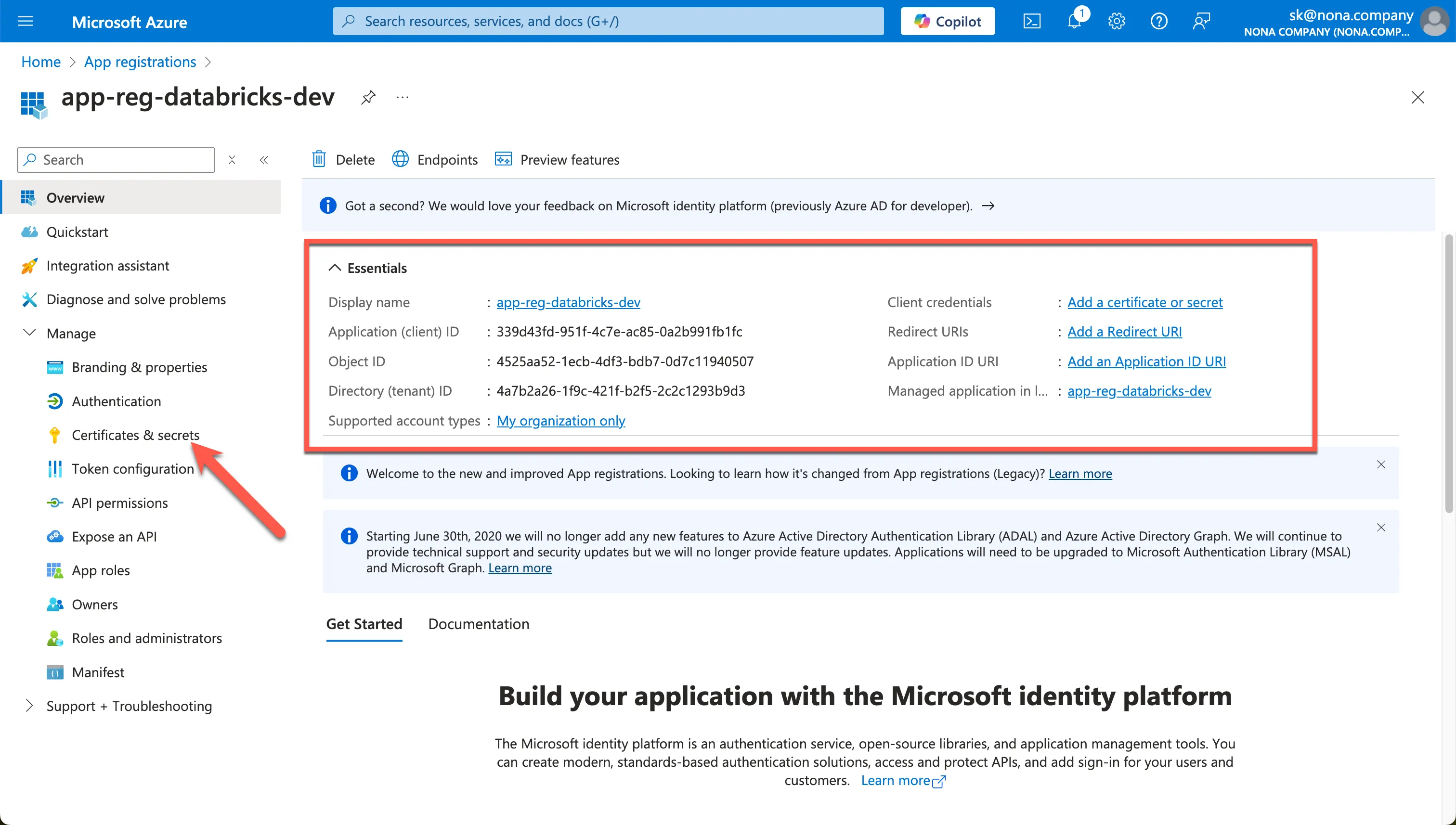 The most important information about the Service Principal can be found on the Overview page. You can also create a Secret.
