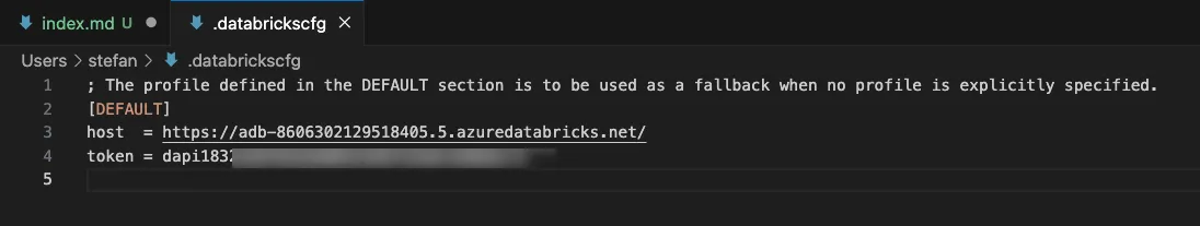 The advantage and disadvantage of this method is that the token is saved in plain text in the .databrickscfg file. You should, therefore, refrain from using this method on a shared computer.