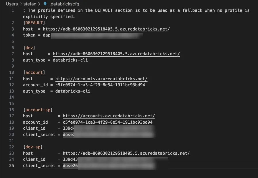 During the process, you are asked for a profile name, for which I have chosen “dev.” You can log in to different Databricks workspaces with these different profile names. The content of the .databrickscfg file then looks like this:
