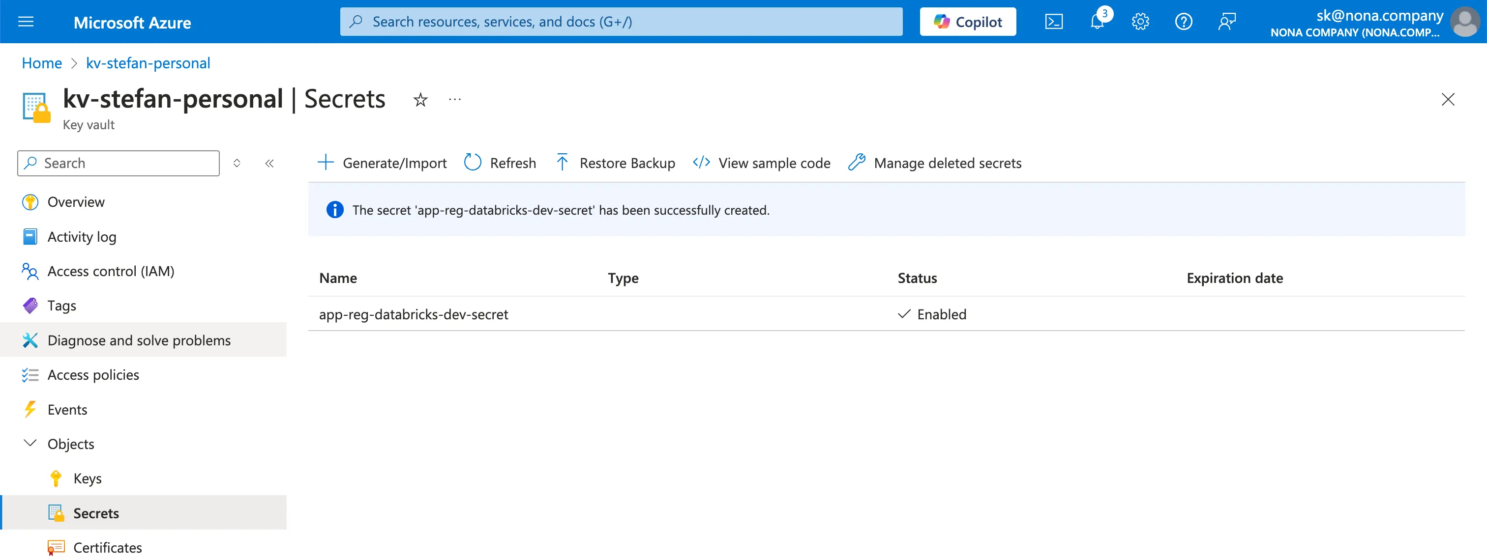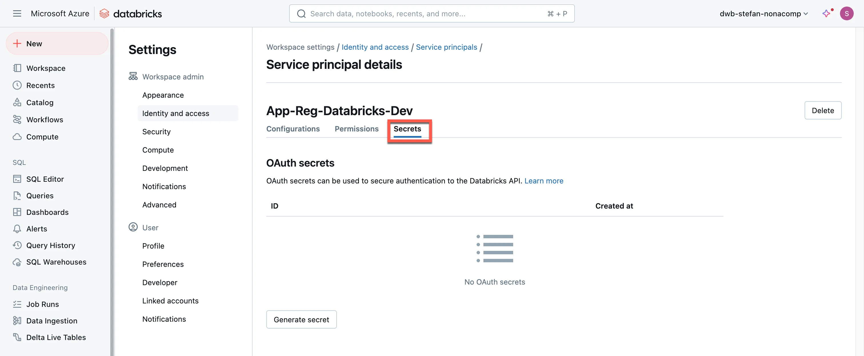 Important: You must add the OAuth Secret from Databricks, not the one generated in Azure!