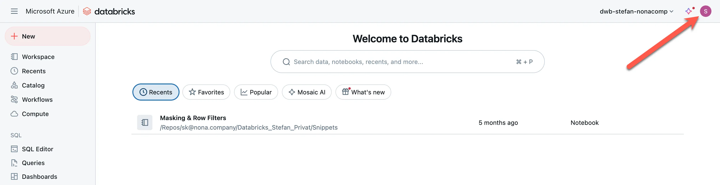 In the Databricks workspace, you can click on the user’s icon, which is located at the top right.