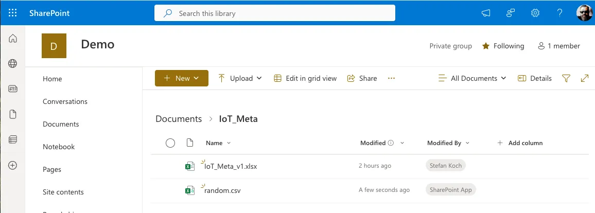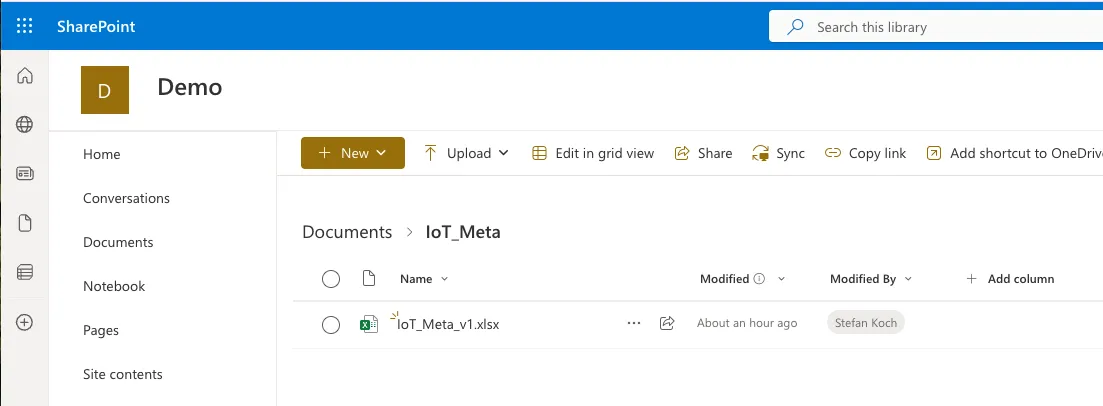 In my example, I created a new SharePoint site named Demo. Inside the Documents Section, I made a folder IoT_Meta and uploaded an Excel file.