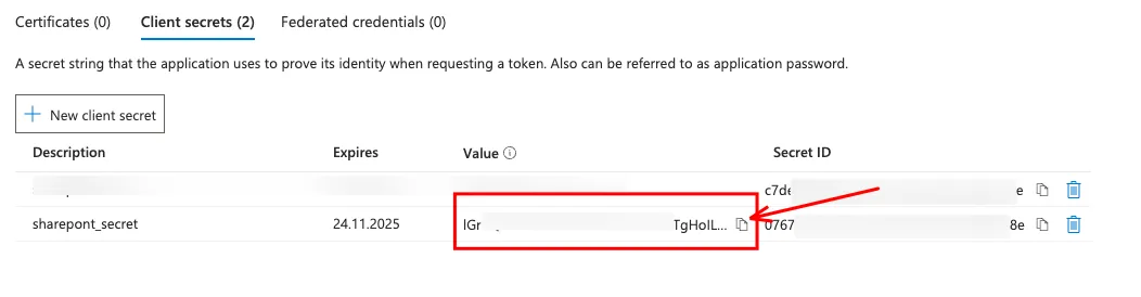 After the secret is created, copy the value to a safe place. You only see the secret once.