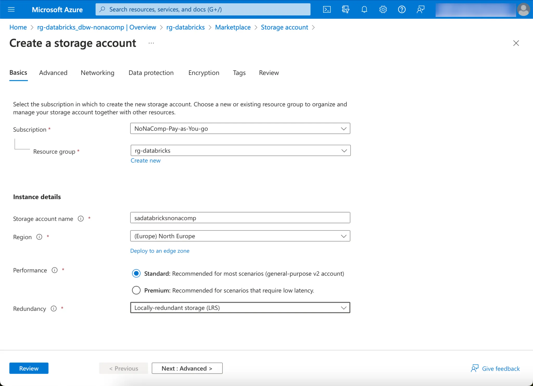 For cost reasons, I choose “Standard” for Performance and LRS for Redundancy.