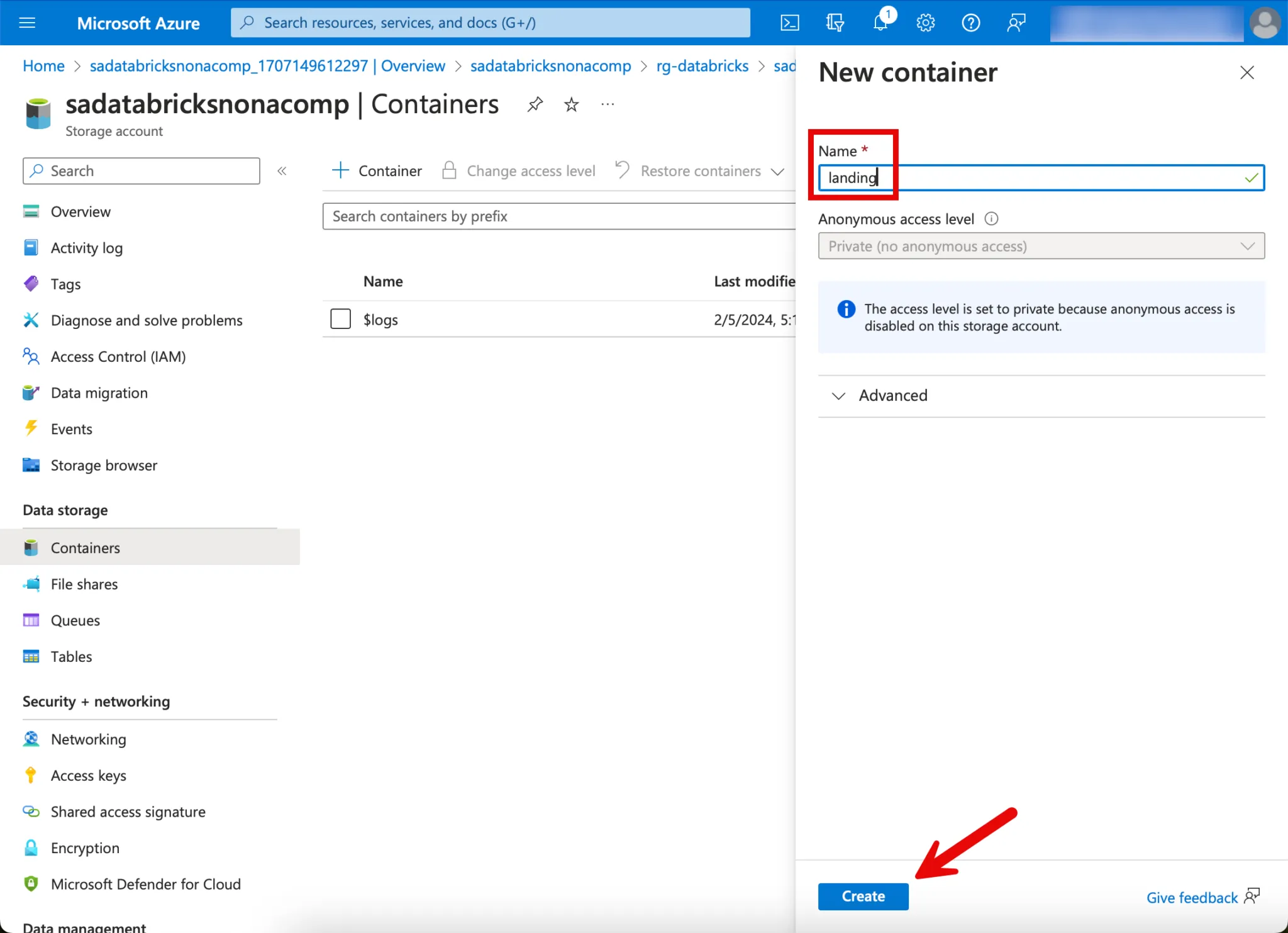 Once the storage account has been deployed, the next step is to create the containers. To do this, you can switch to the “Containers” tab in the context of the storage account.
