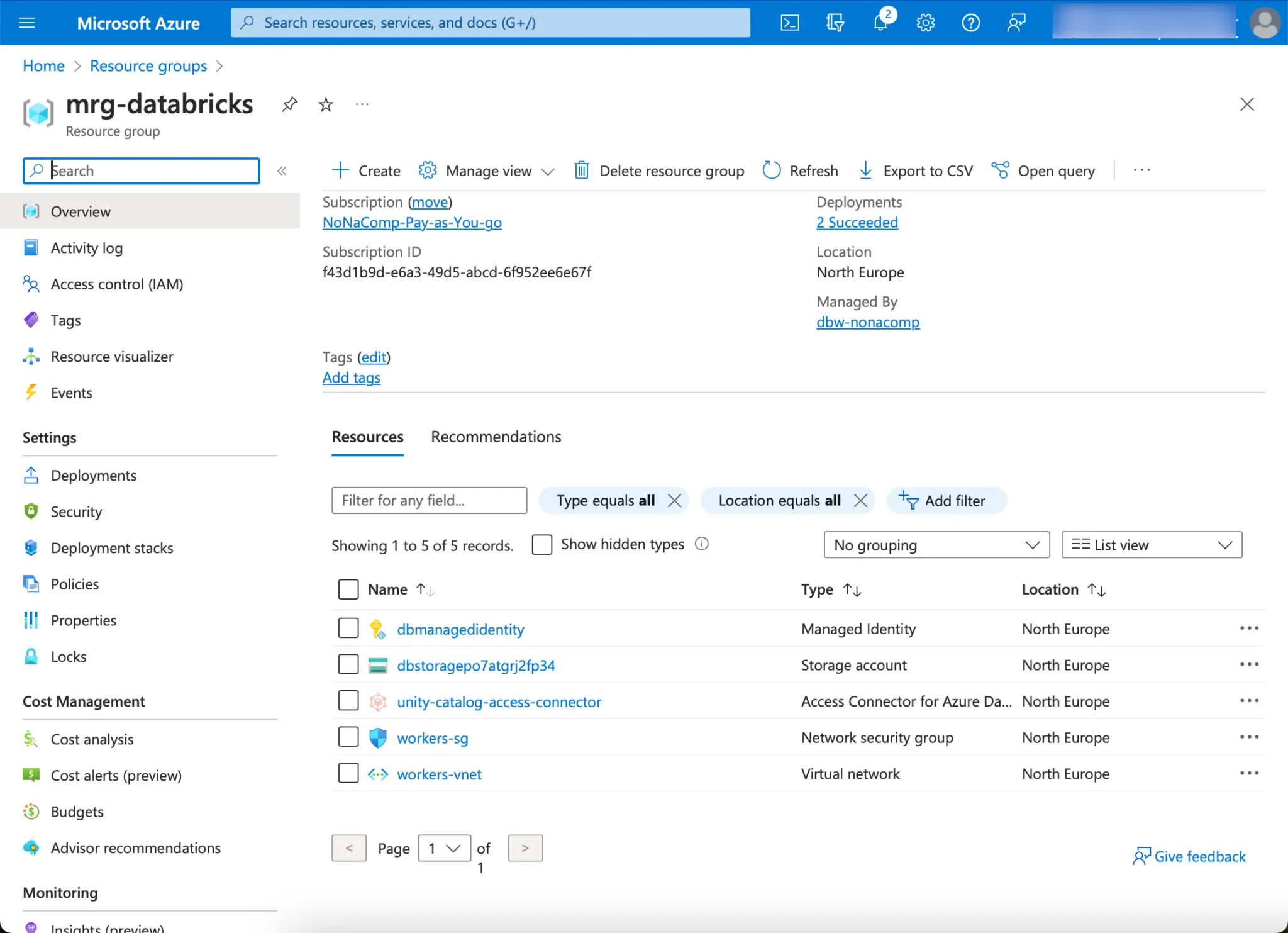 When the Databricks Workspace is created, an additional “Managed Resourcegroup” is created. This contains resources that are automatically created and required for operation. I use a similar name for it as the original resource group by prefixing it with an m, as “mrg-databricks”.