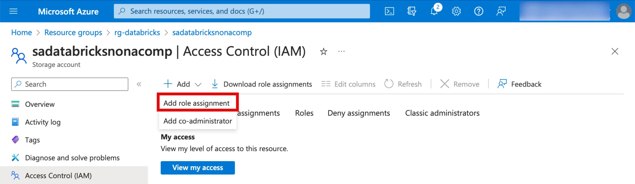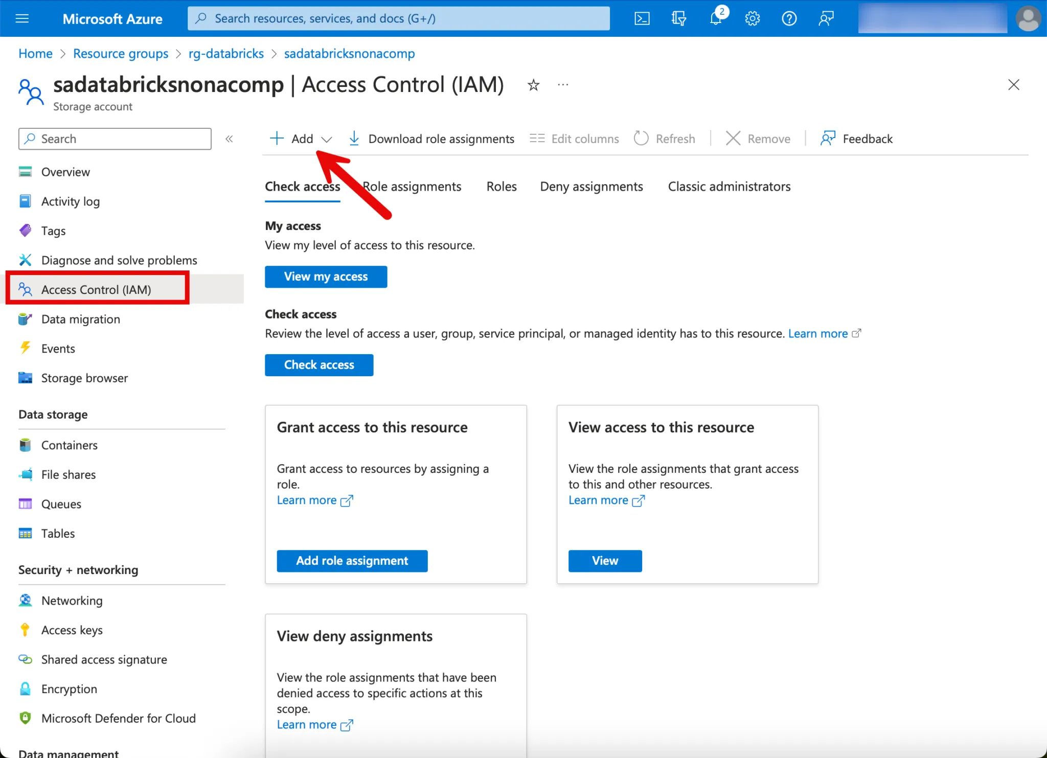 I go back to the storage account and switch to the “Access Control (IAM)” tab. There I click on “Add” and then “Role Assignment”.