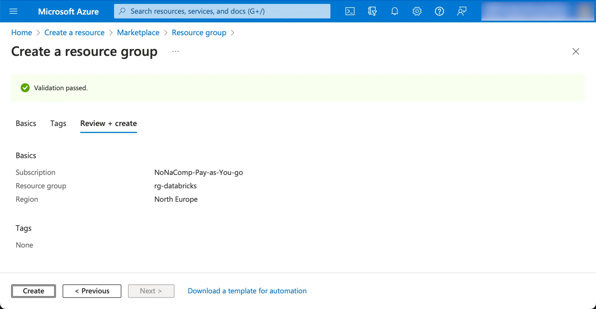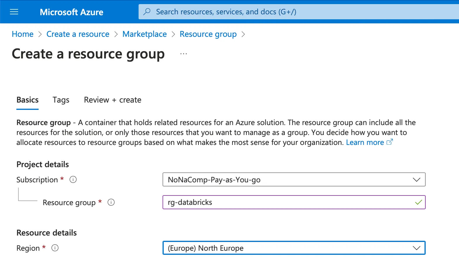 I name the resource group “rg-databricks”. Of course, other names can be used. I use the region “North Europe” as the location. I am based in Switzerland, so a region in “Switzerland North” or “Switzerland West” would be closer, but the regions in Europe are a bit cheaper. I also create all subsequent resources in this region.