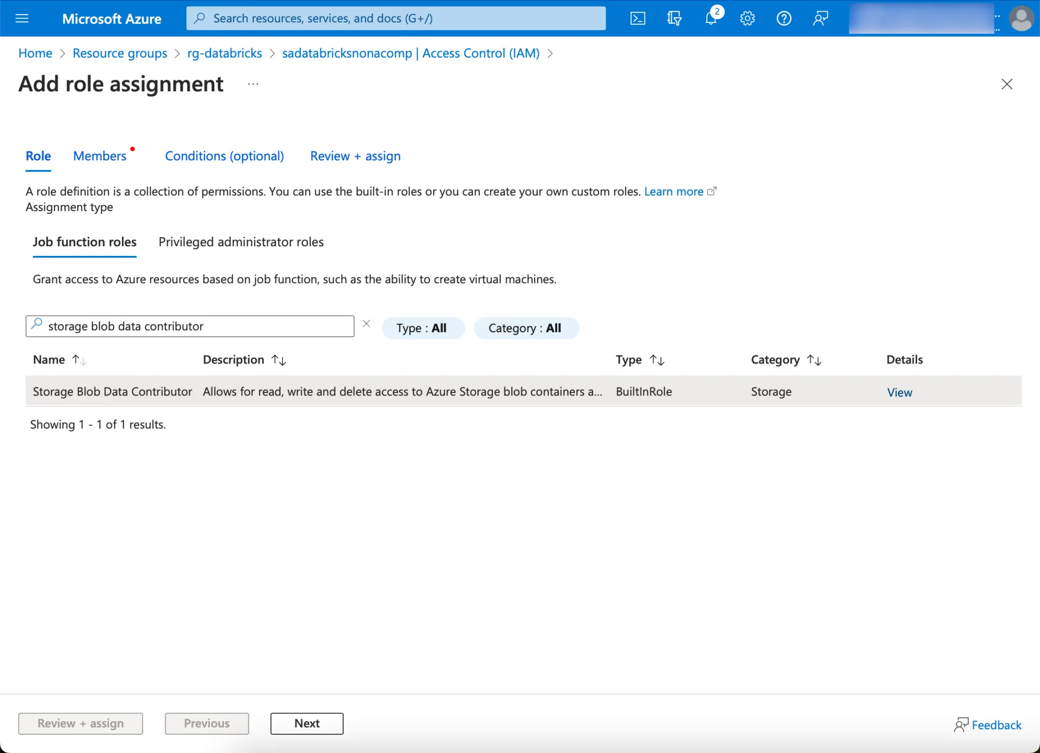 In order to be able to work with the data in the containers, appropriate authorizations must be set. Governance and access is implemented with Unity Catalog. This means that the respective users do not have to be authorized directly on the data lake, but can be administered centrally in Unity Catalog. To enable Unity Catalog to manage the authorizations, the “Access Connector for Azure Databricks” resource must be authorized on the storage. This resource was automatically created with the Databricks setup and is located in the “Managed Resourcegroup”. You can find the resource by looking in this resource group.