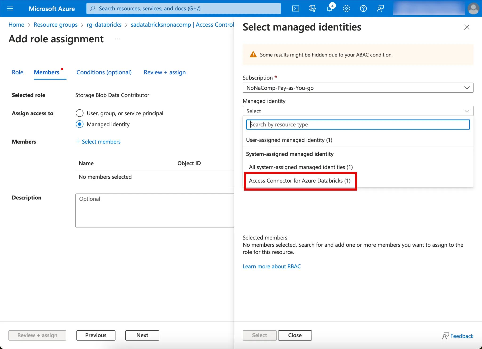 On the Members tab, I click on “Managed Identity”, Select members and search for the Access Connector.