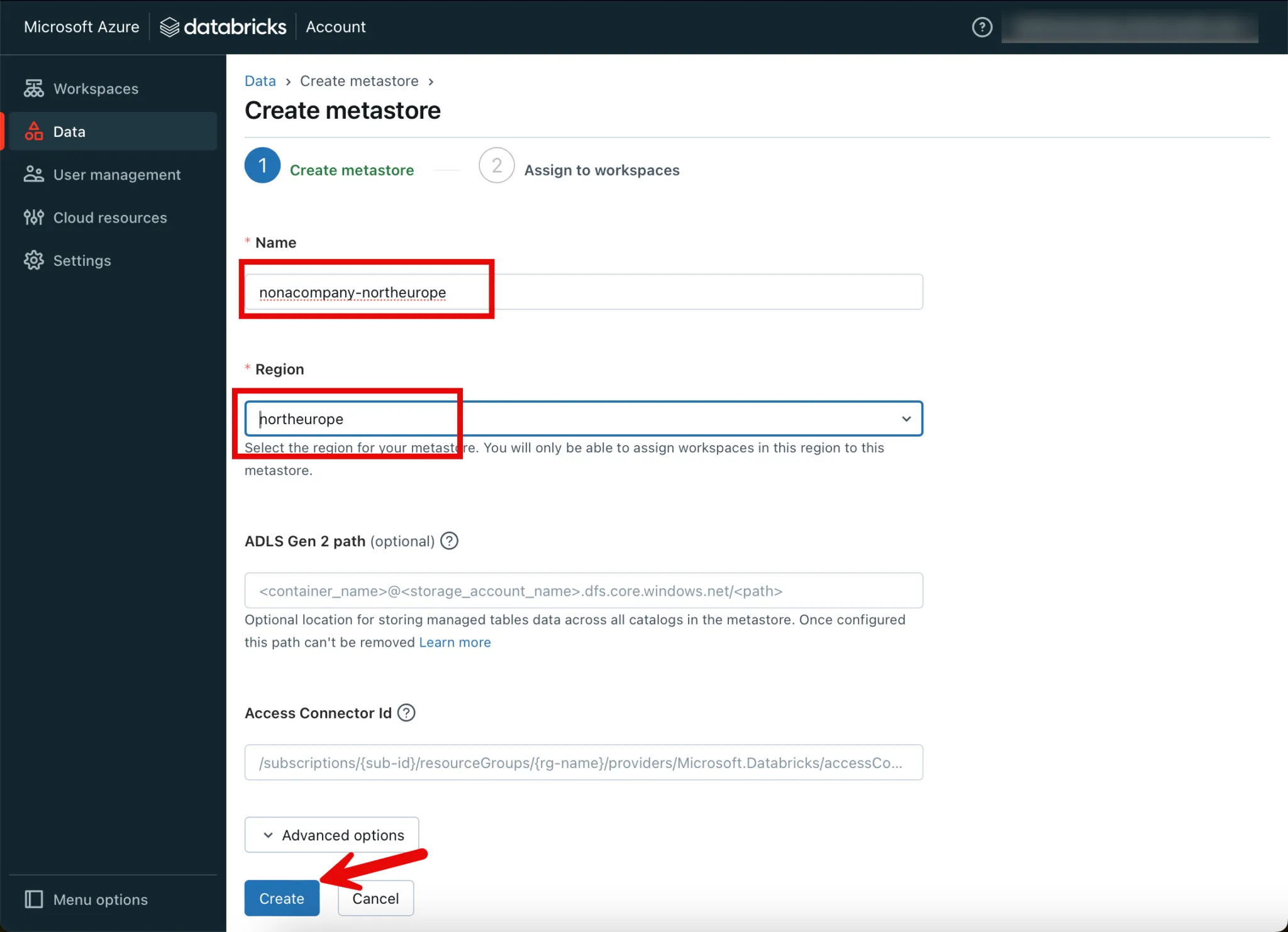 Only one metastore can be created per region. I choose the same region as my Azure resources.