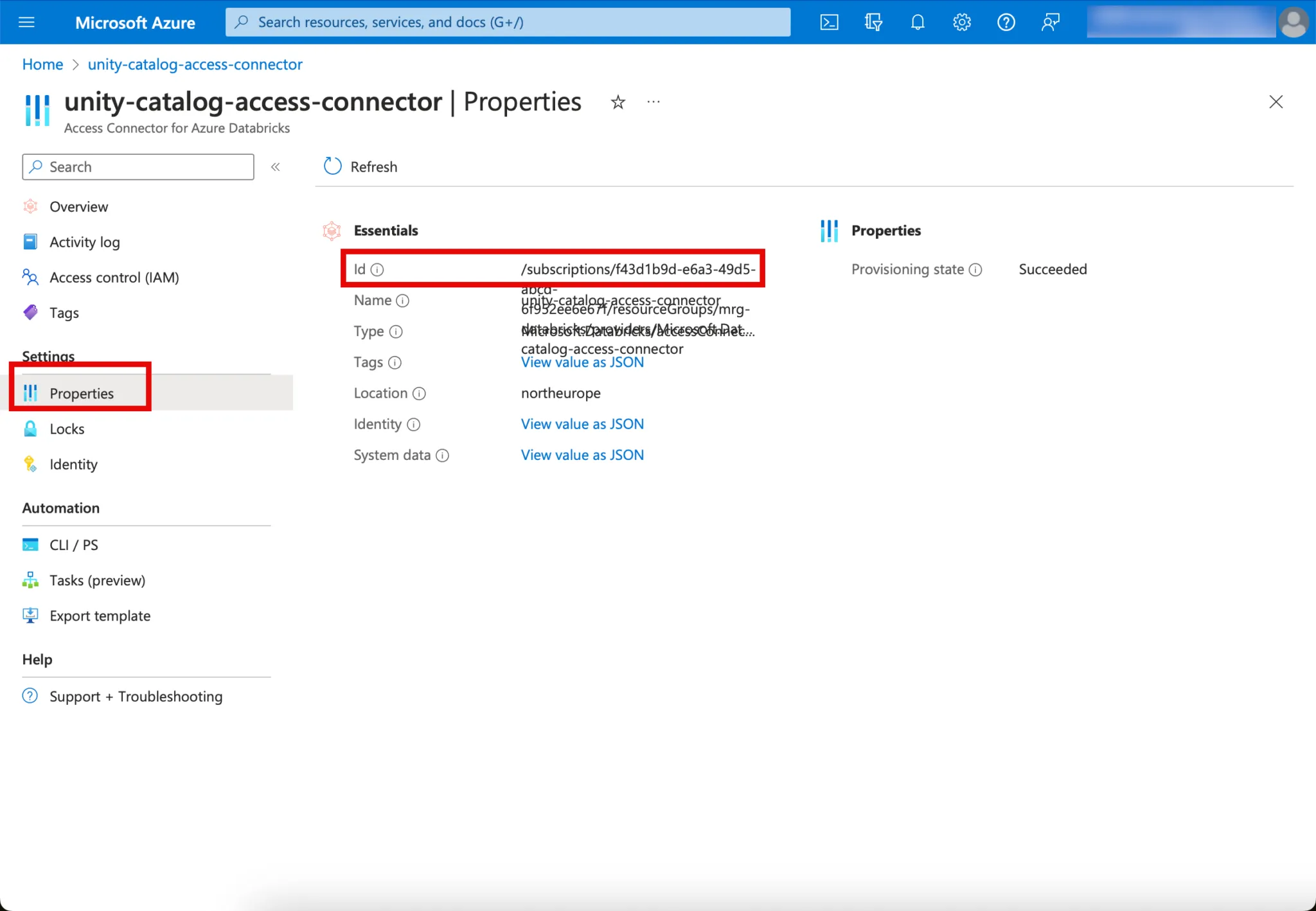 You can see the Access Connector ID if you look in the properties of the Access Connector resource in the Managed Resource Group: