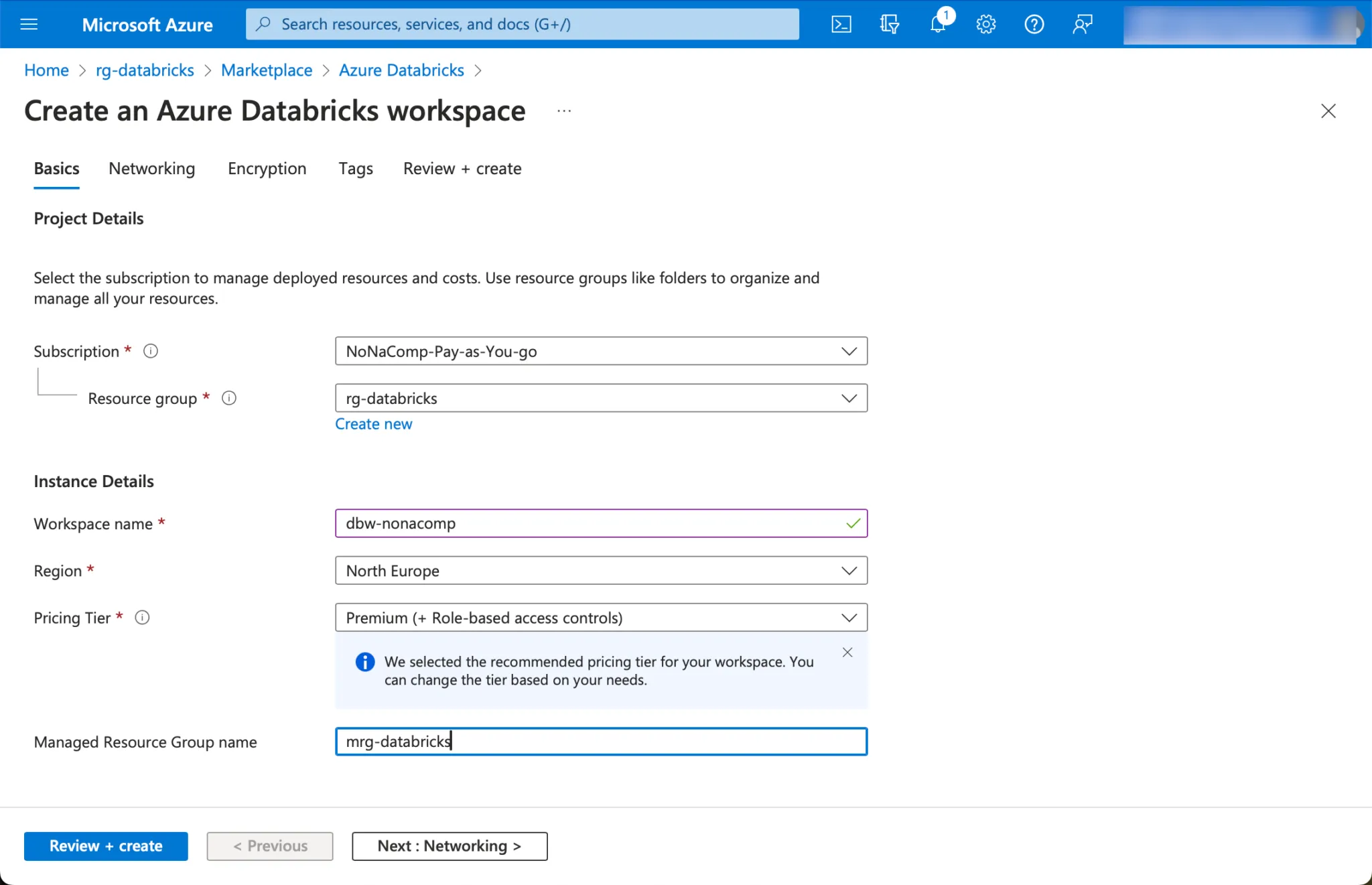 For the workspace name, I assign a meaningful name accordingly. I have an example of a fictitious company “NoNameCompany”, which I abbreviate to “nonacomp”. As already mentioned, I select the region in the same way as the resource group.