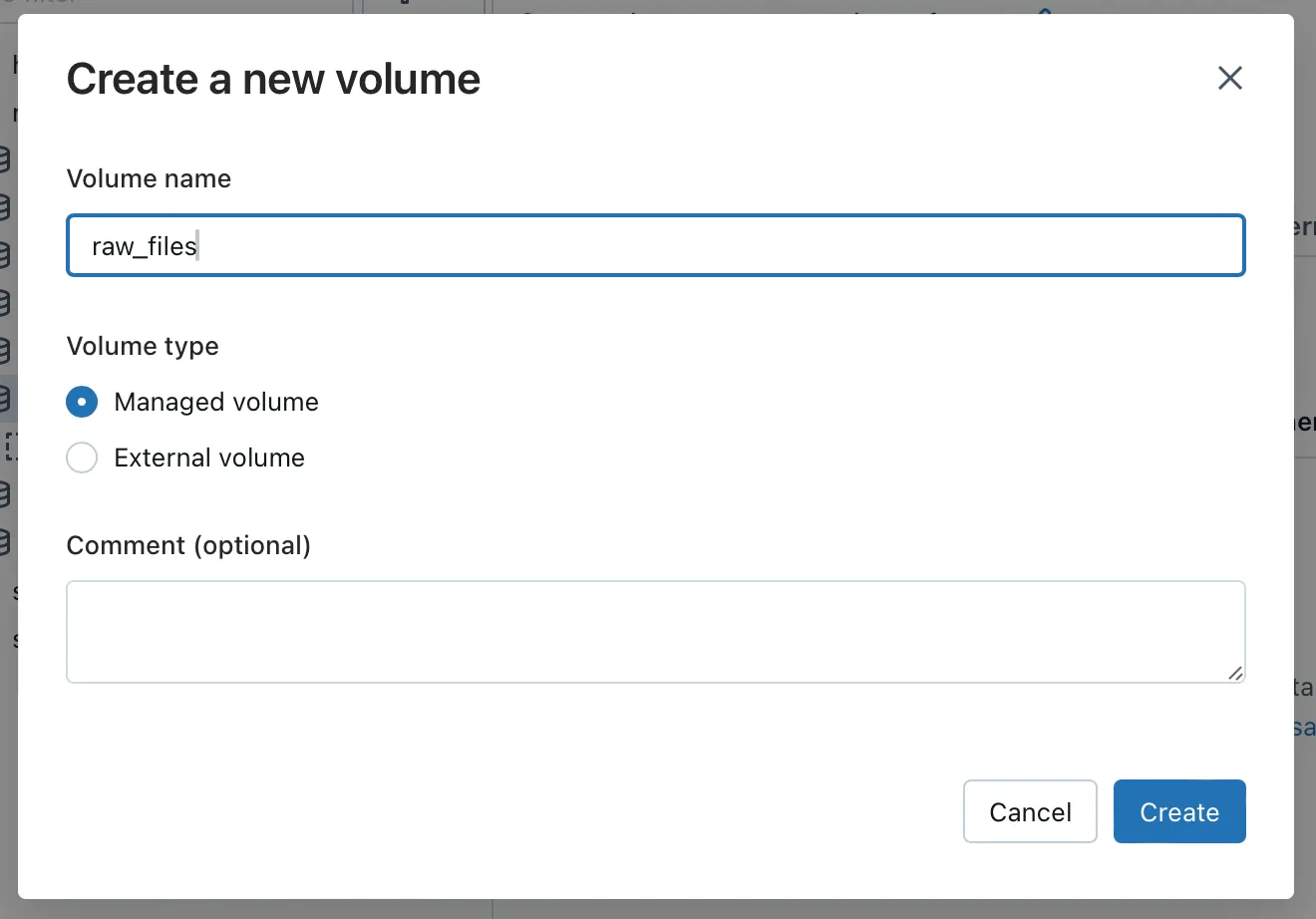 For Raw and Landing, we want to work directly with files that are stored in the Datalake. So that we can access the files directly in Unity Catalog, we use so-called volumes. To do this, I switch to the raw schema. At the top right is the “Create” button, under which a volume can be created.