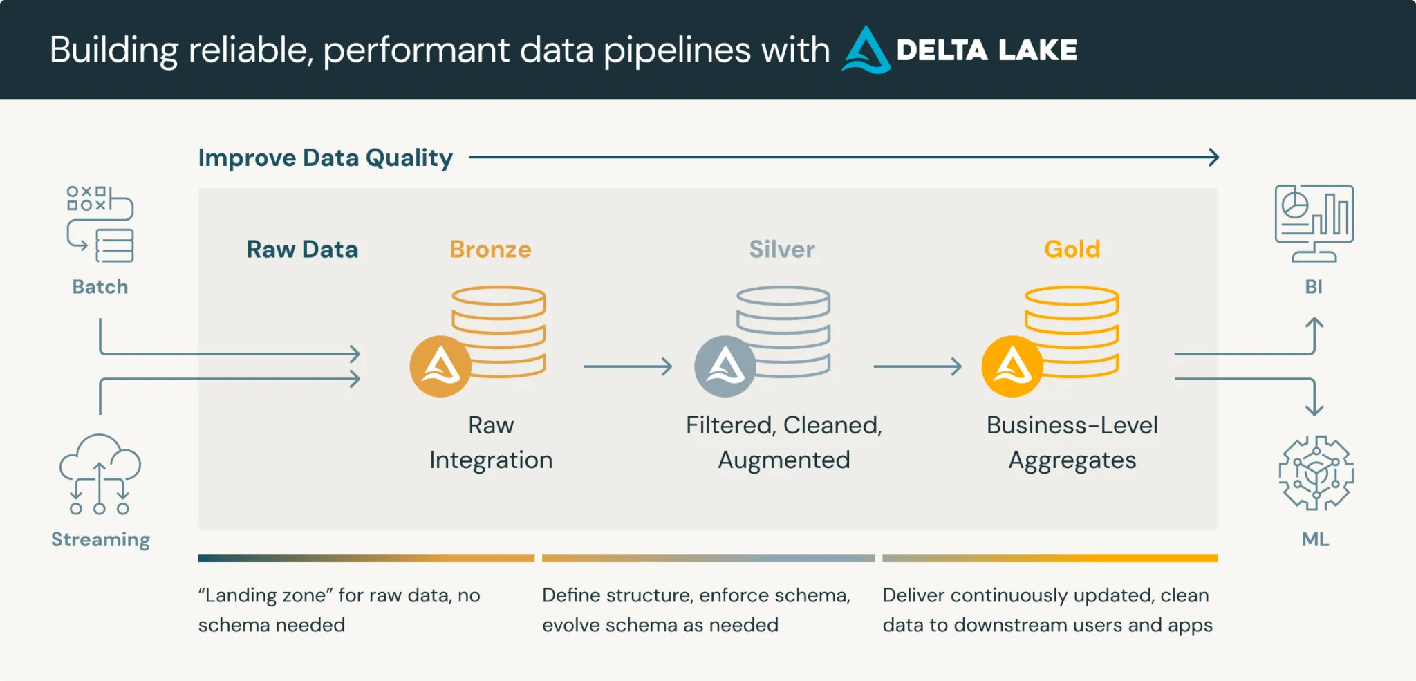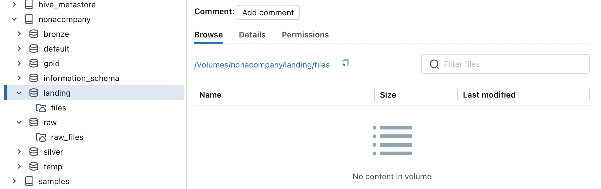 Landing zone: Delivery of files from third-party systems. This zone is transient, i.e. the data is only stored temporarily, processed by the data pipeline and the files are either moved to Raw or only the content is stored in Bronze. After processing, the data in the landing zone is deleted.