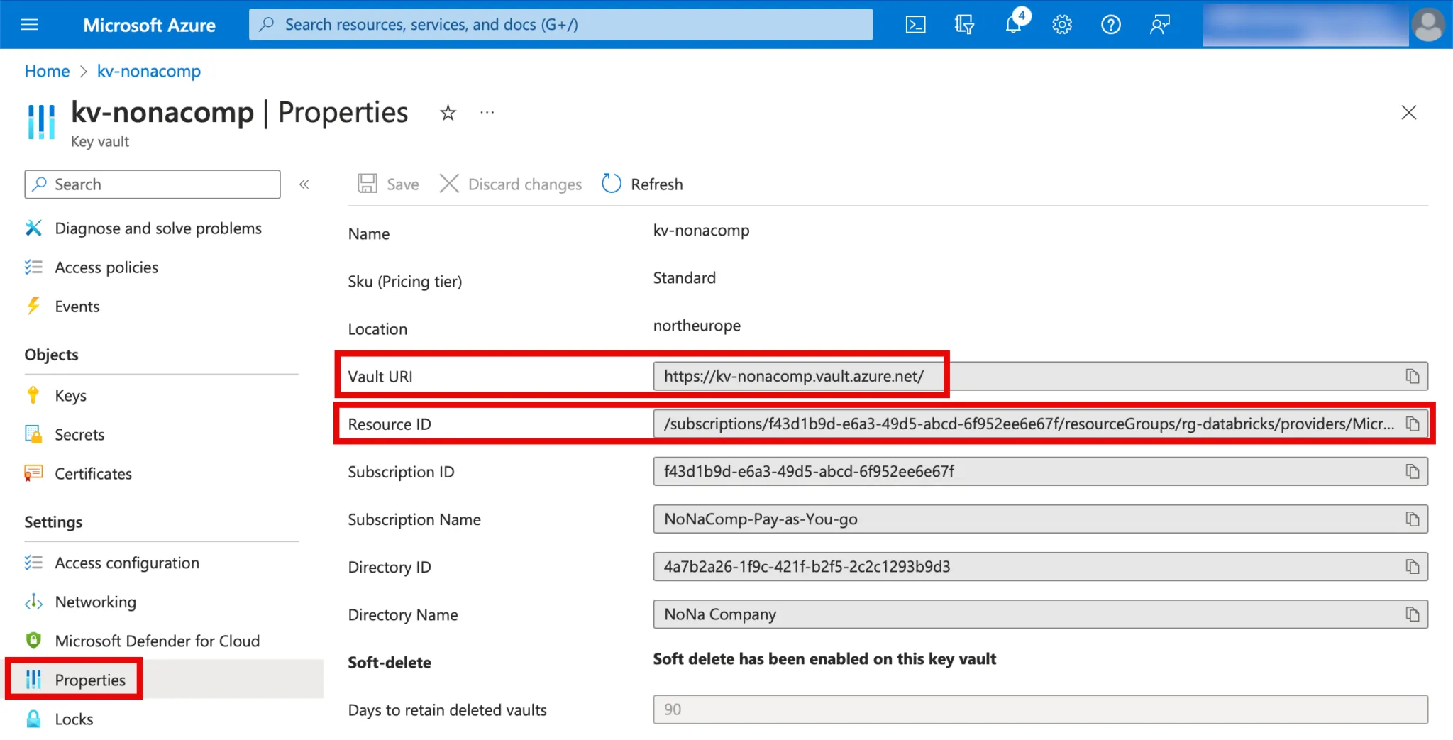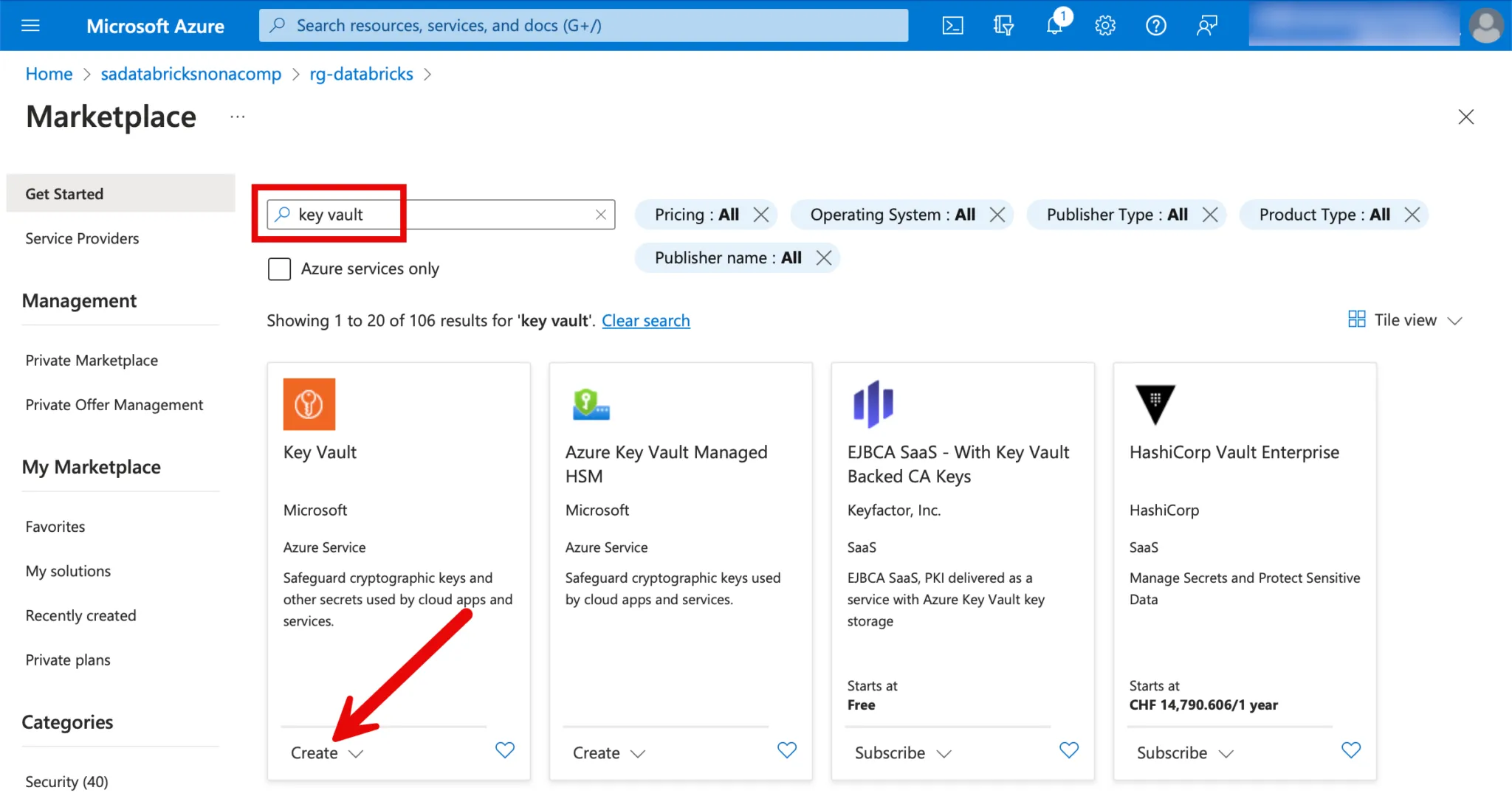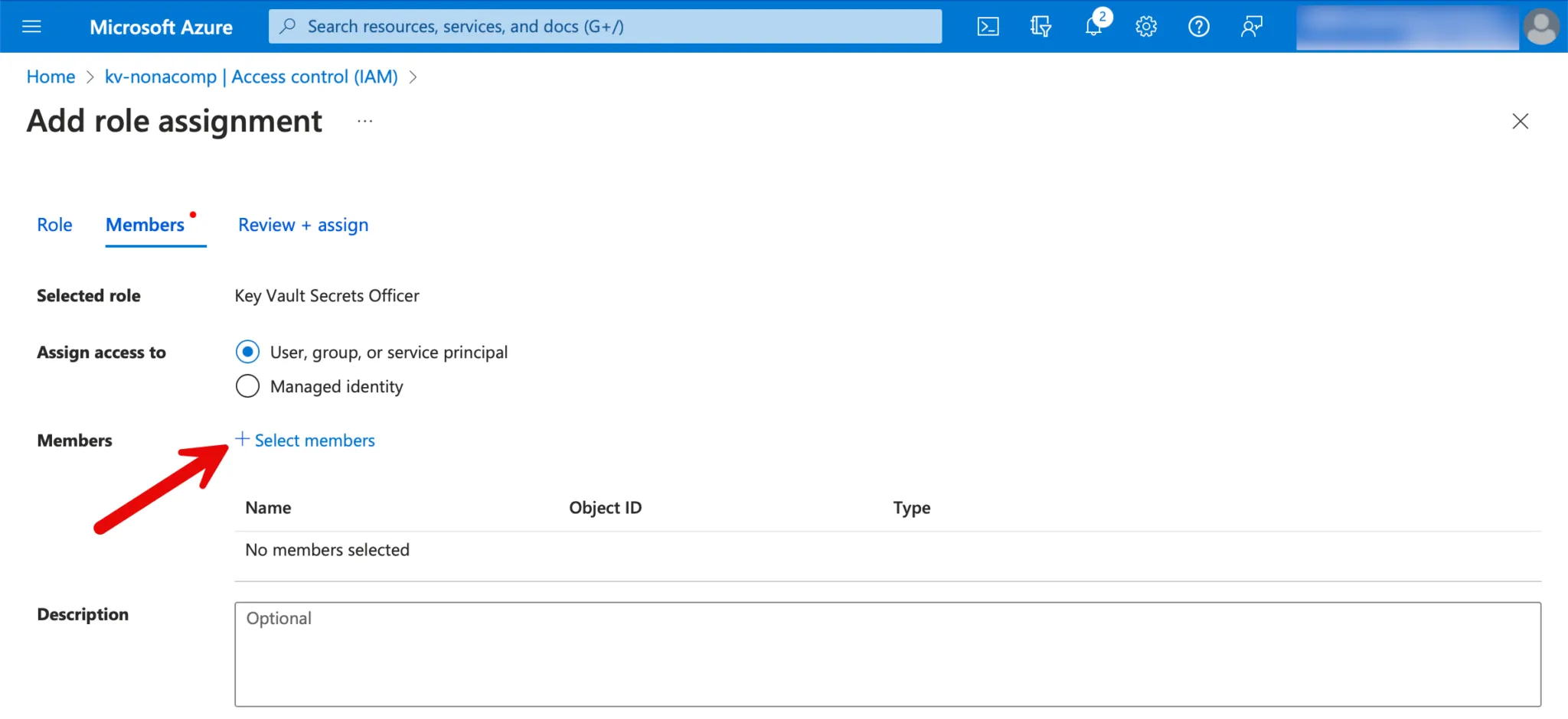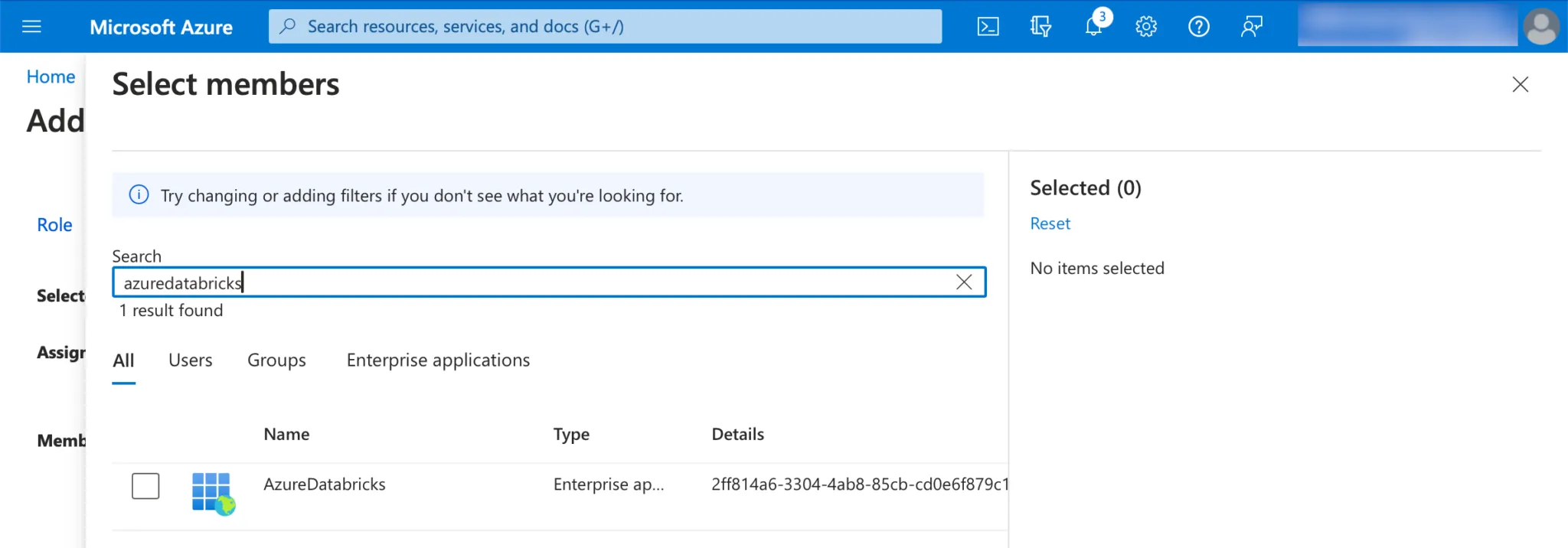 We also want to read the secrets via Databricks, so we also add the memeber “Azure Databricks” to the members.
