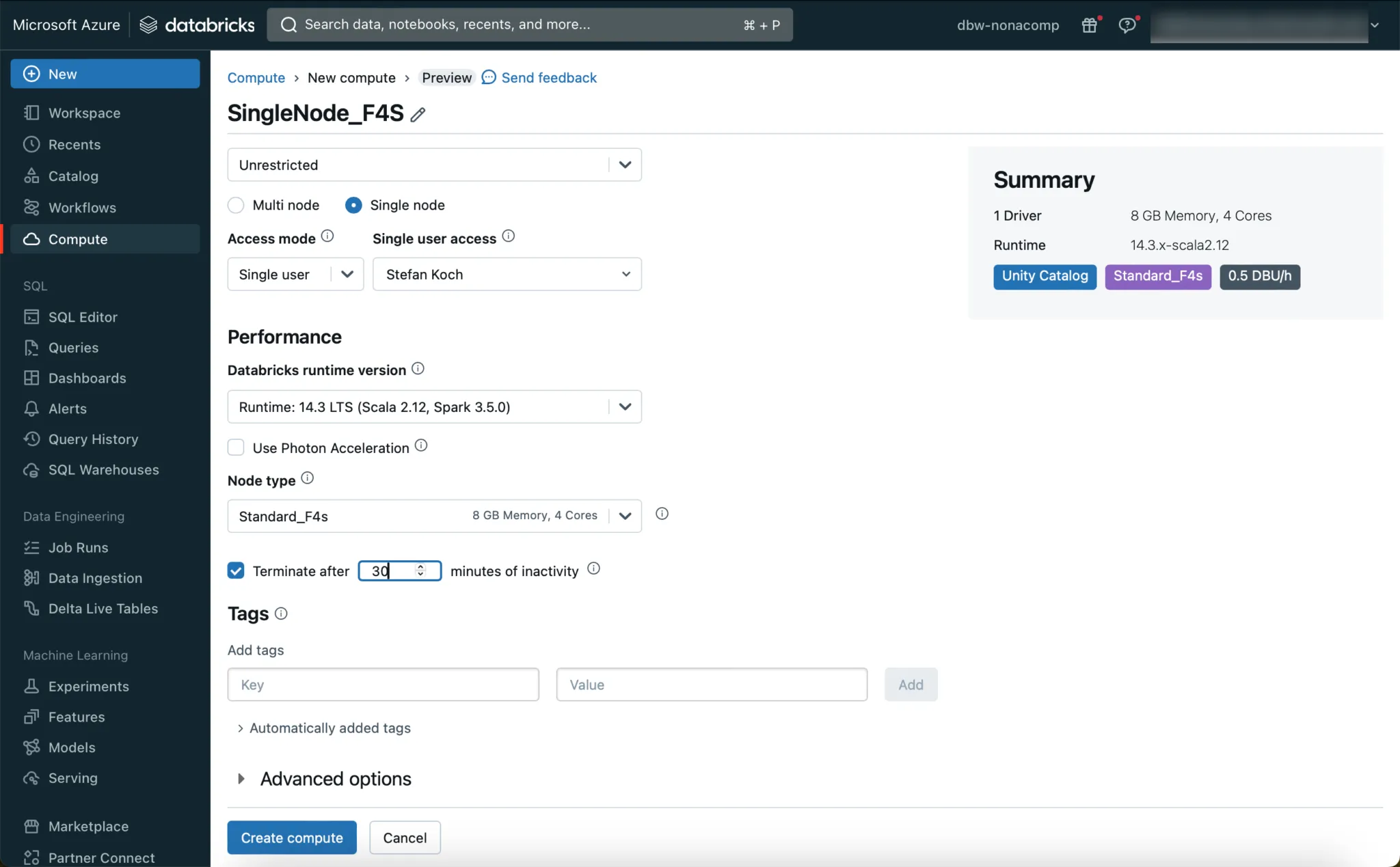 As a rule, you should choose an LTS version for the runtime. For smaller tests and data sets, it is sufficient to create a single-node cluster with a small node type. In Azure, this is the “Standard_F4s” image. If necessary, the cluster can be enlarged later, or an additional cluster can be added.