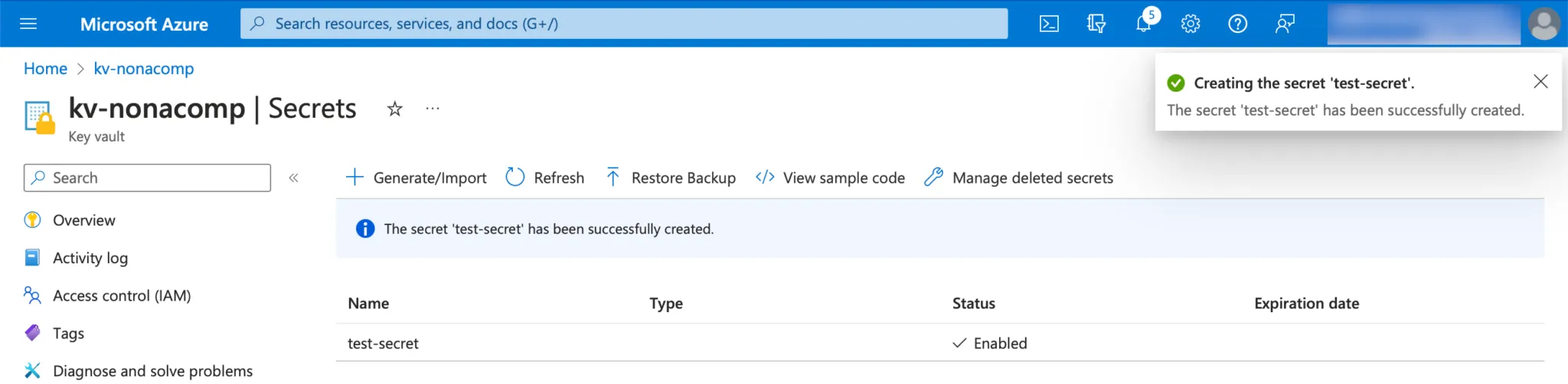 To test that the linking of the KeyVault with the Databricks Secret Scope works properly, I do a small test. I create a simple secret in the KeyVault itself.