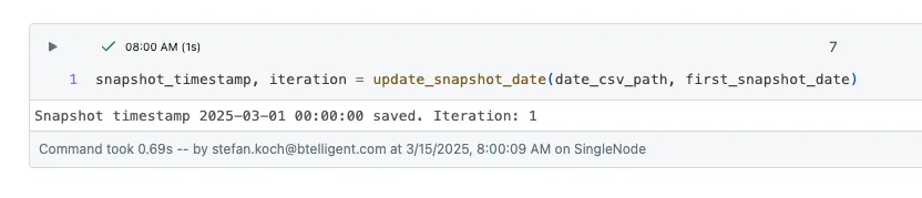 A snapshot is to be created for each execution of the notebook. I want to simulate that a full snapshot is taken every day. To do this, I have to simulate a mechanism in my notebook that each run of the notebook should take place on a subsequent day. To do this, I use a CSV file in which I write the date. During the following run, the last date is read out, incremented by one and written back again. If I want to start the test again, I can simply delete the CSV file.