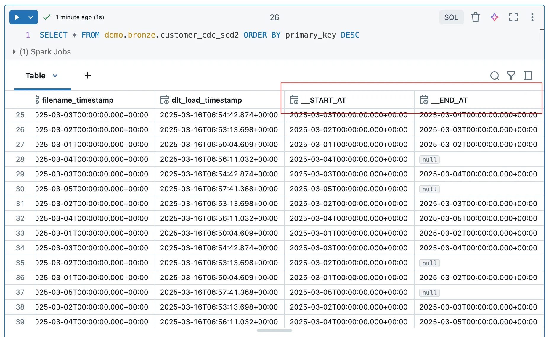 Instead of several steps, this new streaming table can process the data directly. Since we have SCD1, it is a current image of the source table and we do not find any information about the history.