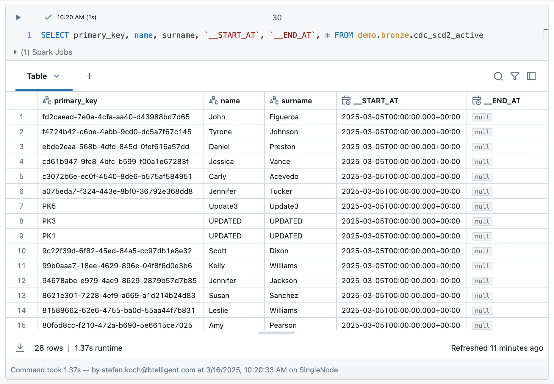 The implementation with SCD2 is relatively simple. The logic is almost the same as for SCD1, but we still have to specify which columns we do not want to compare, namely all columns with additional meta information. The last lines are therefore different to SCD1:
