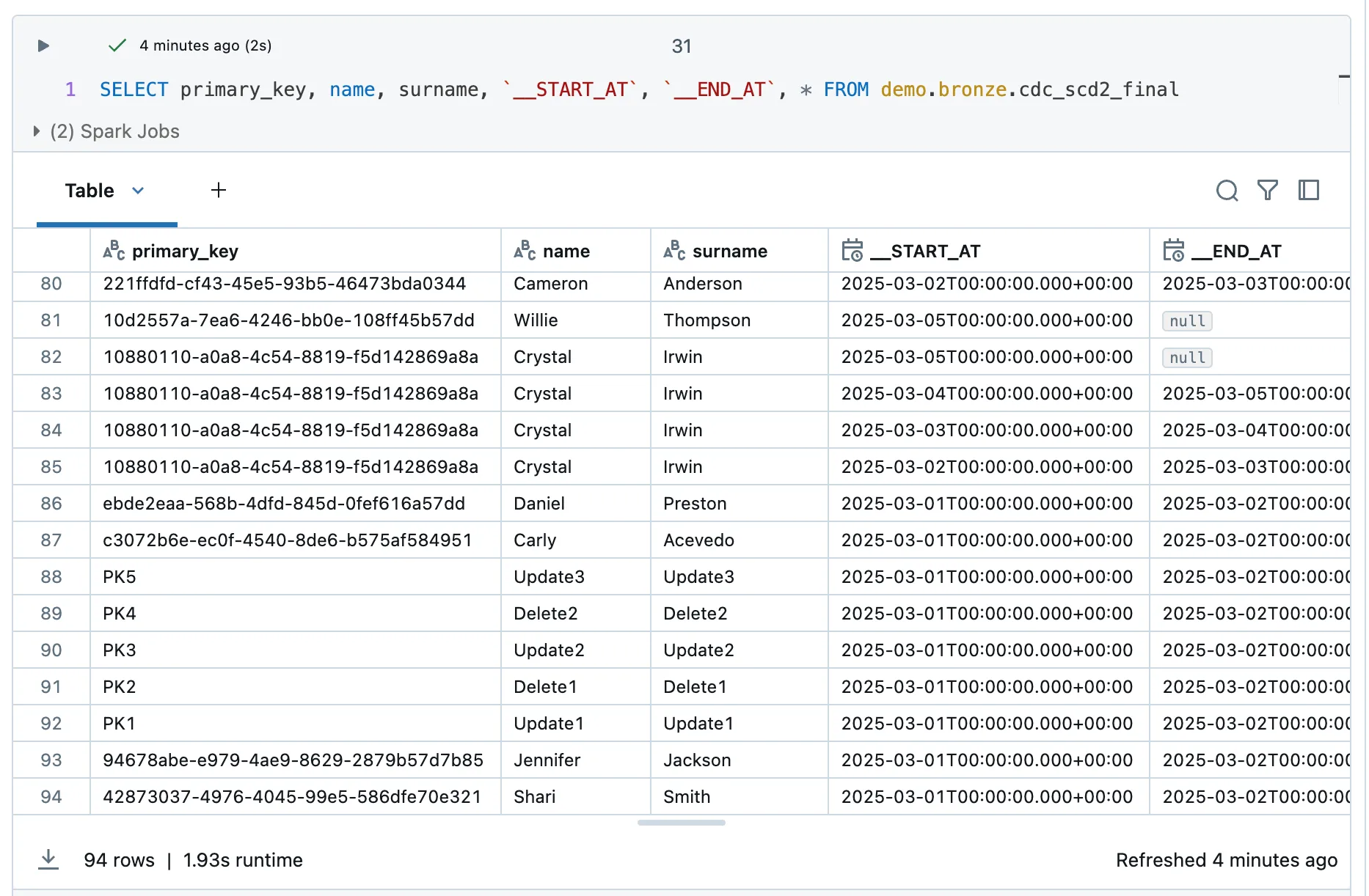I have 94 rows, which is 2 rows less than in the SCD2 table. These are probably the deletes. I check this with a small query to look at the PK2 and PK4 rows.
